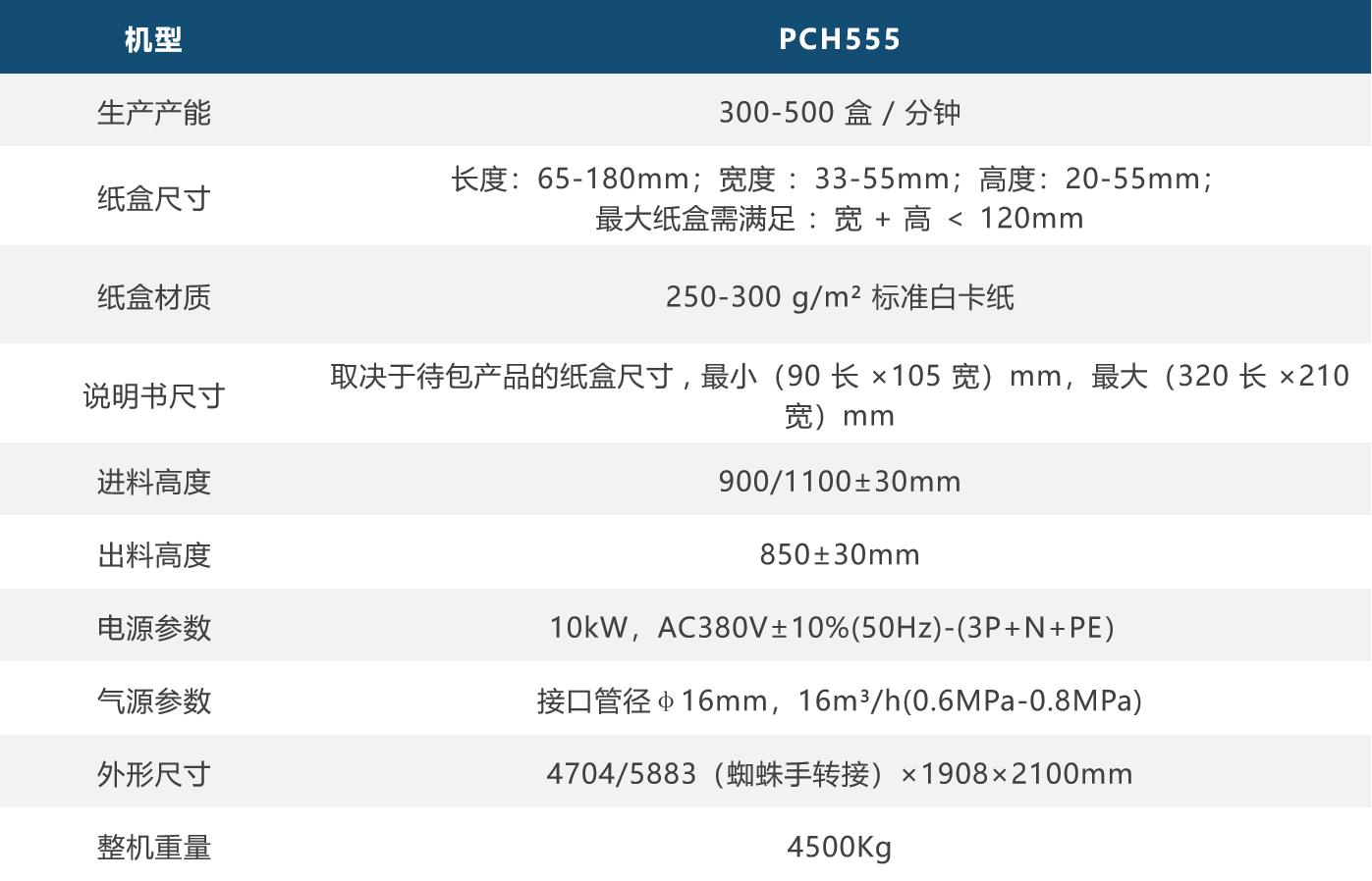PCH555 装盒机是一款全自动超高速卧式装盒机,整机设计及制造遵循GMP、cGMP、GAMP5、CRF21- part11、CE 的规范要求,主要用于西林瓶、预充针、安瓿瓶、口服液瓶、BFS 等产品的泡罩装盒或裸瓶装盒,具有自动进料输送、说明书或小册子在线下料、纸盒输送开盒、产品和说明书装载、纸盒封盒等功能,具有进料检测,说明书料位、输送、入盒检测,纸盒开盒、输送、封盒检测等生产全过程监测系统。