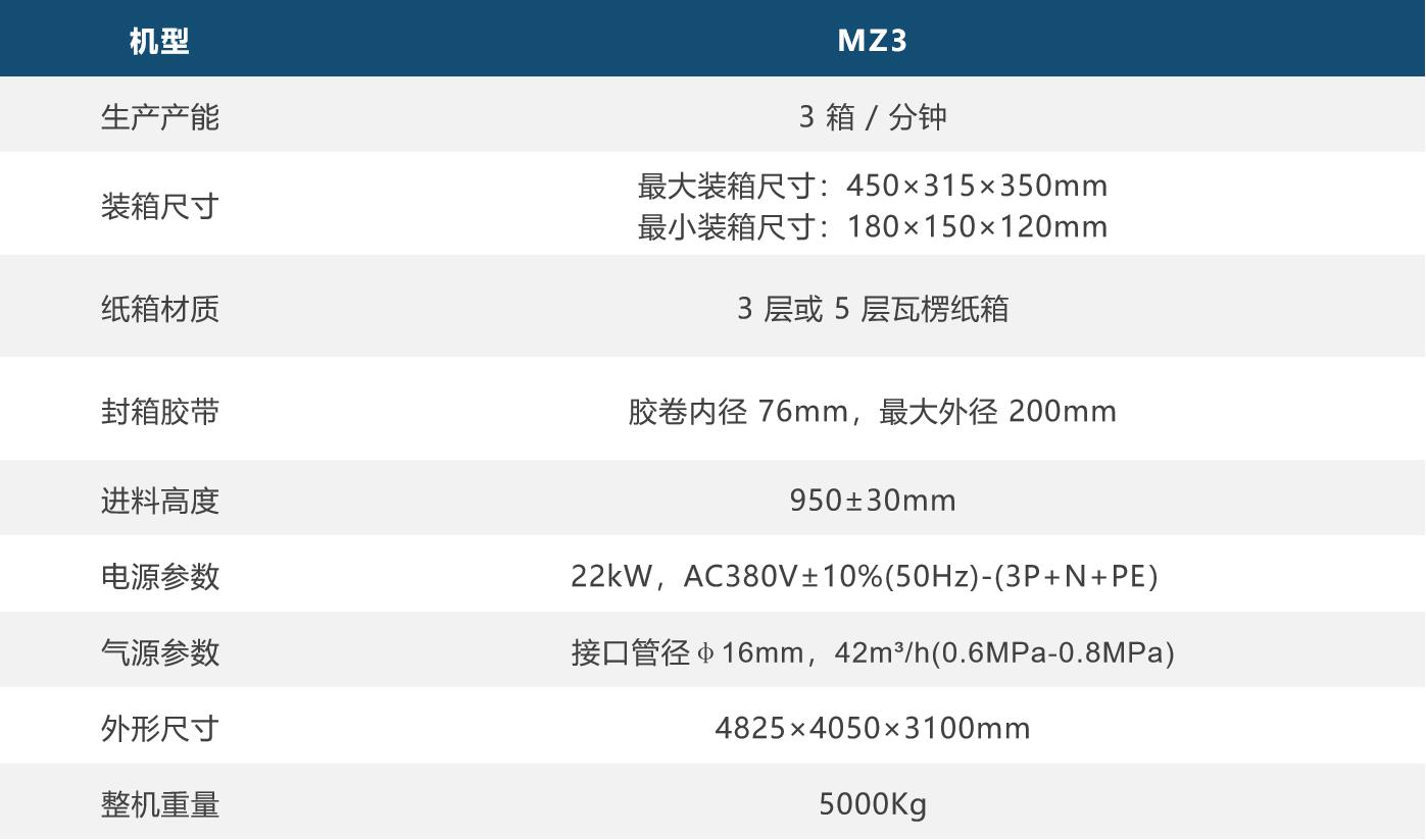 MZ3 装箱码垛机是一款全自动立式装箱码垛一体机,整机设计及制造遵循 GMP、cGMP、GAMP5、CRF21-part11、CE的规范要求,主要用于西林瓶、预充针、安瓿瓶、卡式瓶、BFS 等产品的小盒、中包或中盒进行装箱,具有自动进料理料、纸箱开箱、立式装箱、垫板纸投放、合格证投放、胶带封箱、大箱标签打印贴标、捆扎打包、自动码垛等功能;配有进料检测,纸箱料位、输送、到位检测等生产全过程监测系统。