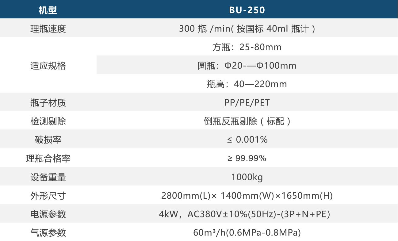 BU-250 是一台高速自动理瓶机,整机设计及制造遵循 GMP、cGMP、GAMP5、CRF21-part11、CE 的规范要求,适用于圆瓶、方瓶、扁瓶等各类形状的塑料瓶的有序整理,可广泛应用于制药、食品、保健品、糖果、日化等领域。