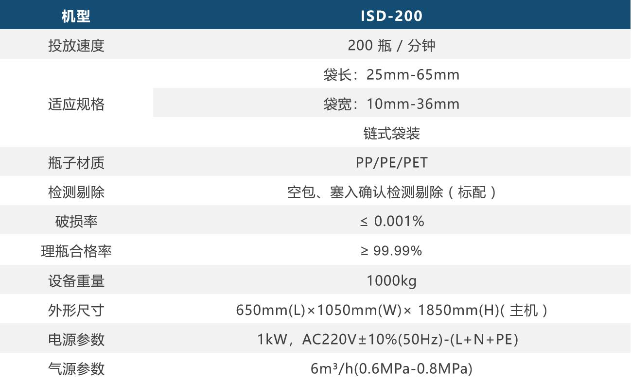 ISD-200 是一台袋装干燥剂投放机,整机设计及制造遵循 GMP、cGMP、GAMP5、CRF21-part11、CE 的规范要求,用于在包装容器内投入链式袋装干燥剂、脱敏剂、调料包等。可广泛应用于制药、食品、保健品、糖果等领域。