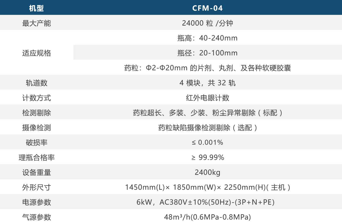 CFM-04 是一台四通道伺服数粒机,整机设计及制造遵循 GMP、cGMP、GAMP5、CRF21-part11、CE 的规范要求,主要用于各种片剂、软硬胶囊、丸剂及其它固体制剂的数粒分装。可广泛应用于制药、食品、保健品、糖果等领域。