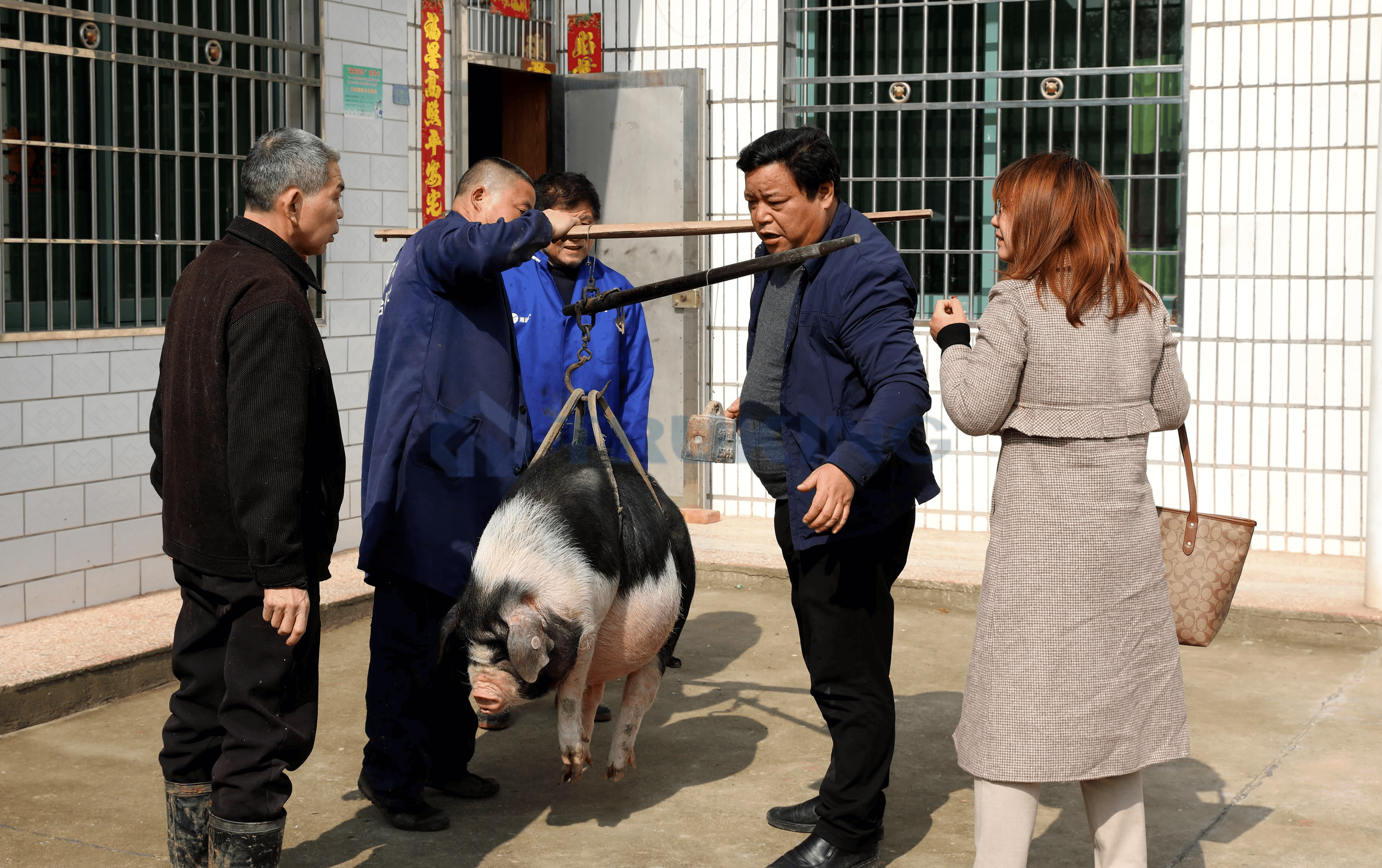 2019年1月、3月,OD平台,OD(中国)科技优价收购杨喜全喂养的4头花猪用于企业食堂。宁乡市喻家坳乡南岭村支书周立军(右二)表示,村里已经协助杨喜全把鱼塘承包下来,杨喜全将借助OD平台,OD(中国)科技之前提供的鱼塘养殖启动资金养鱼