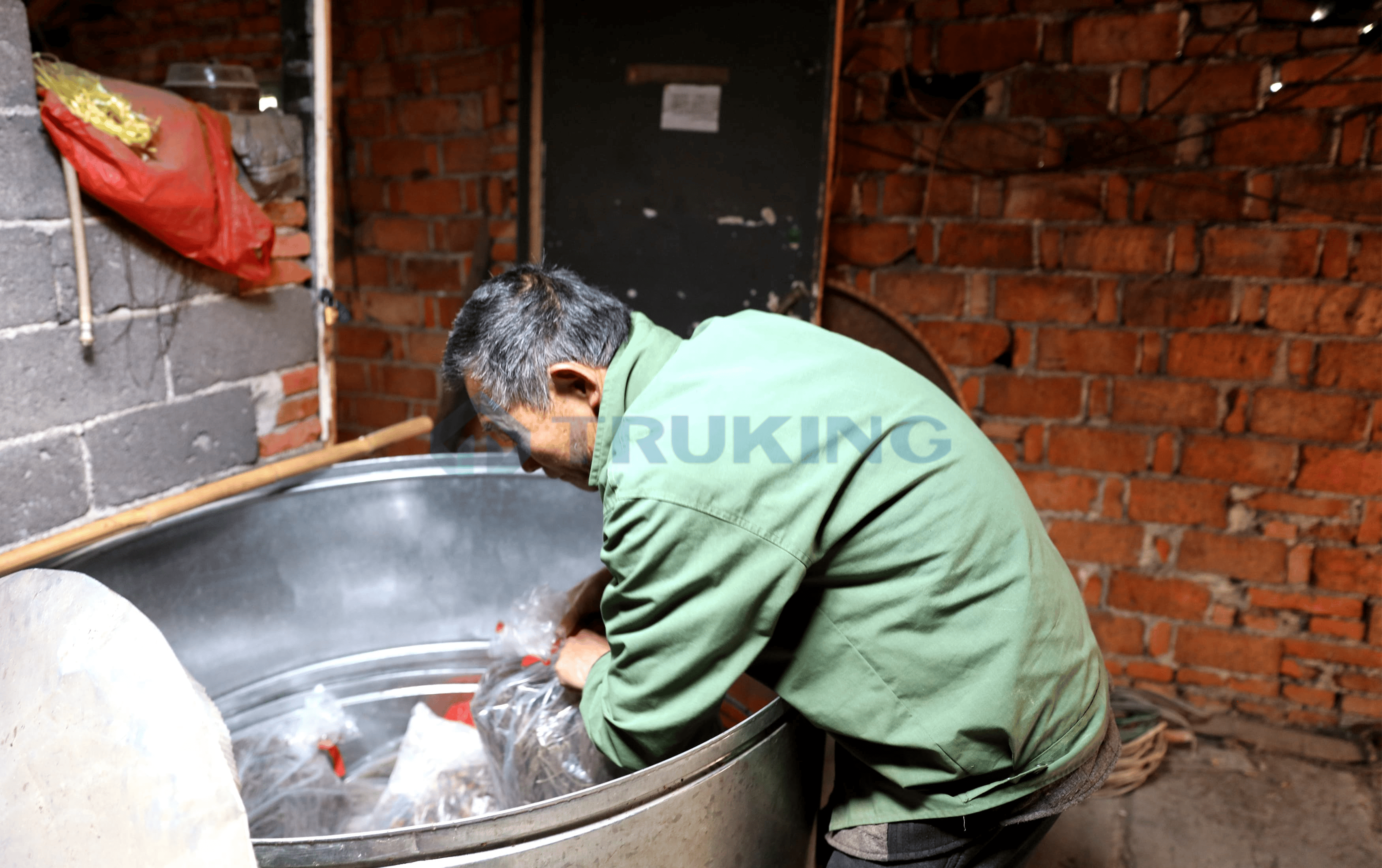 徐桂才(中)自己制作了200多斤红薯粉,这是当地的一种传统特色食品,但零售困难,经南岭村支书周立军(左)的介绍,OD平台,OD(中国)科技按精准扶贫政策一次性收购,徐桂才非常开心