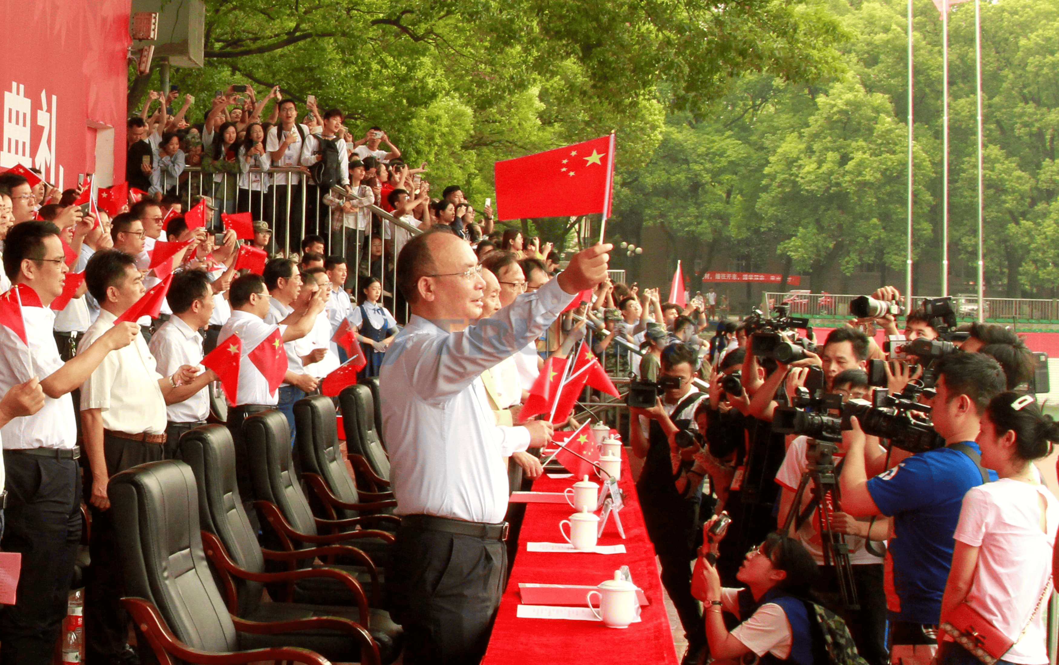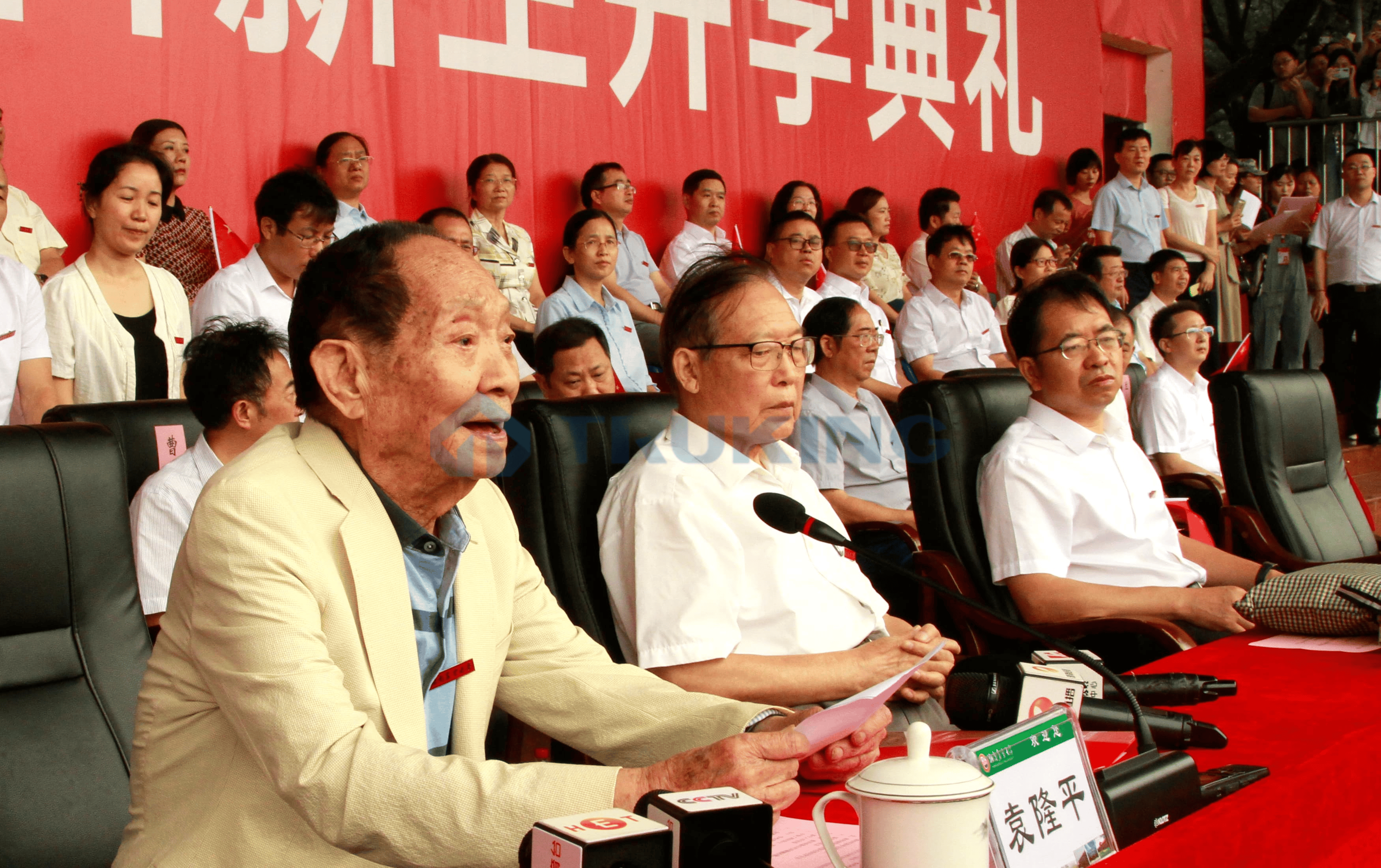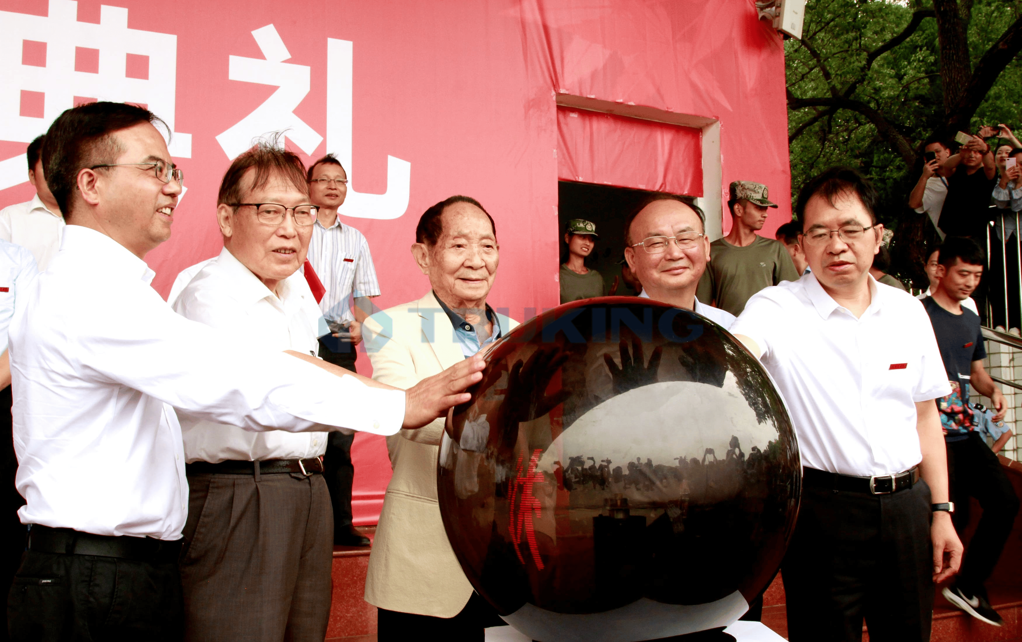 袁隆平,中国工程院院士、湖南农业大学校长邹学校,中国工程院院士、湖南农业大学教授官春云,湖南农业大学党委书记陈弘,以及唐岳,共同按下启动球,开启新生激扬青春之旅