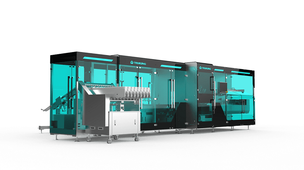 用于冻干粉针剂二次包装,包括入泡罩、装盒、装箱、封箱、监管码打印与扫描、生产批号印制、捆扎及码垛等。