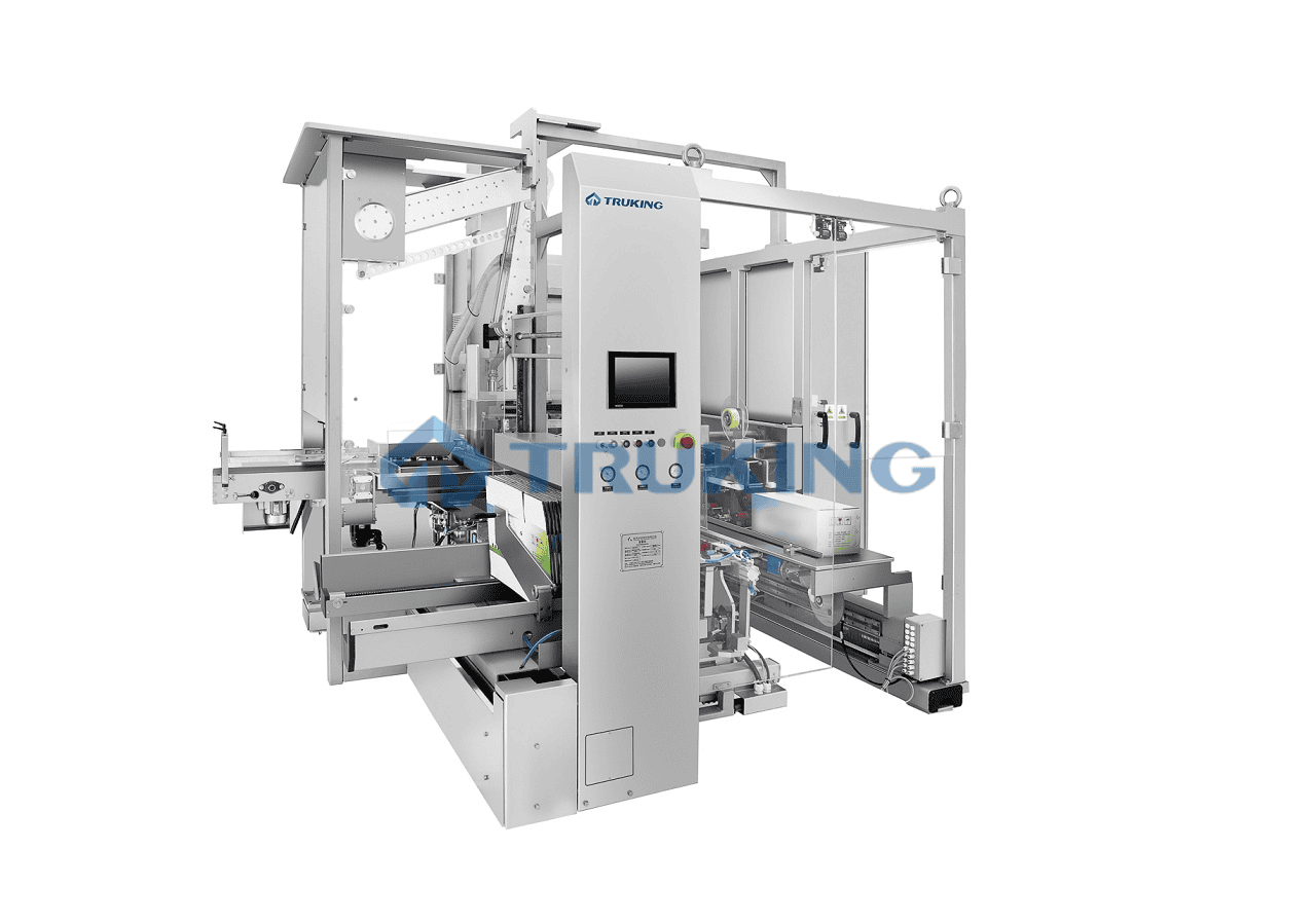 TRUKING series Automatic case packer machine is versatile unit catering to palletizing of pharmaceutical and food Industry. Machine is able to cater wide range of cartons with automatic staking and loaded with state of art features of printing and inspection.