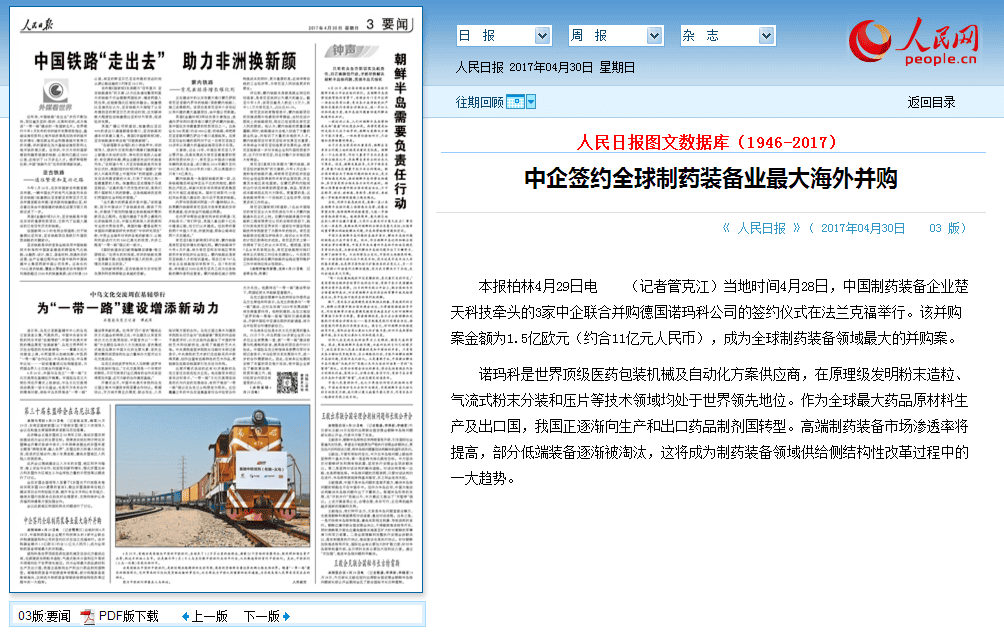 本报柏林4月29日电 (记者管克江)当地时间4月28日,中国制药装备企业OD平台,OD(中国)科技牵头的3家中企联合并购德国诺玛科公司的签约仪式在法兰克福举行。该并购案金额为1.5亿欧元(约合11亿元人民币),成为全球制药装备领域最大的并购案。