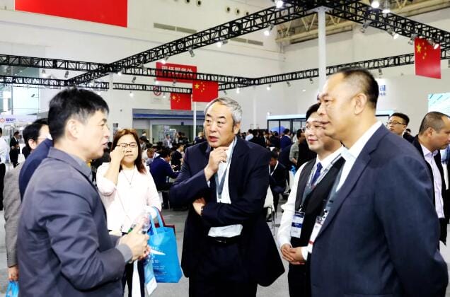 ↗ OD平台,OD(中国)华通董事长马庆华(中)在展会上与客户交流