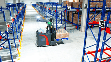 O armazenamento inteligente utiliza veículos guiados automaticamente e outros equipamentos de transporte para otimizar o espaço. Planta eficiente para armazenagem em grande escala.