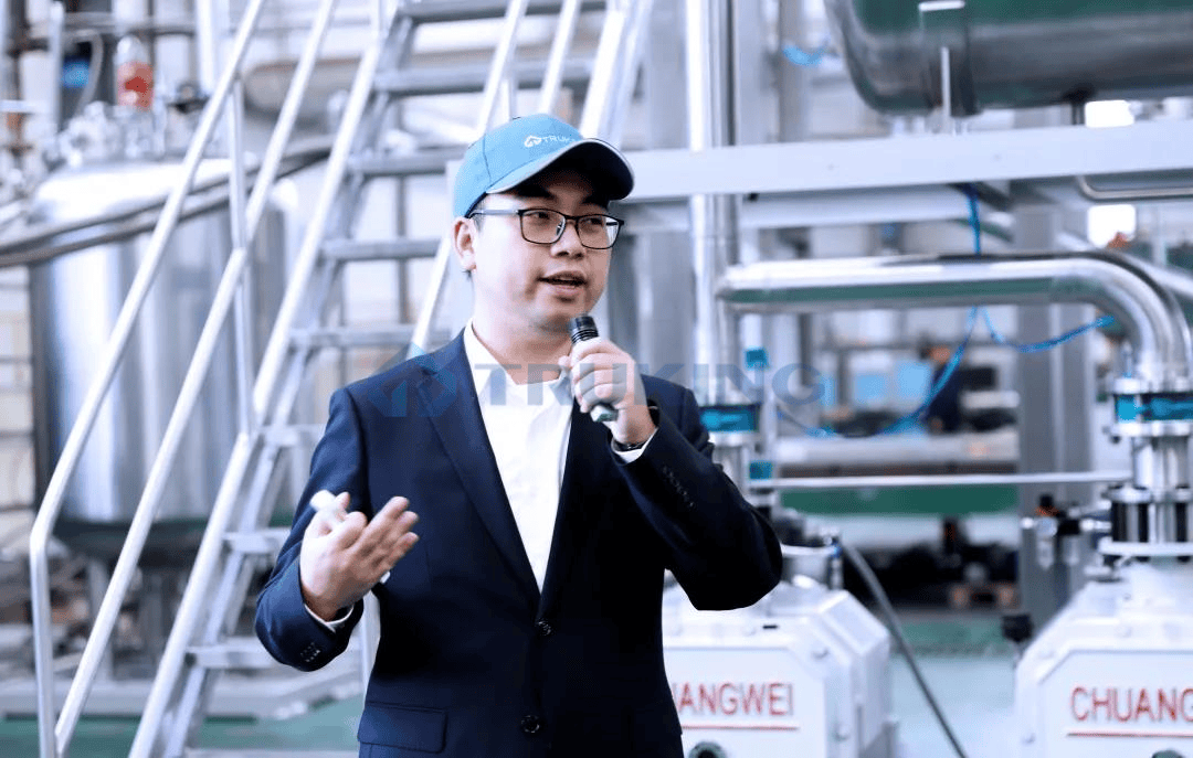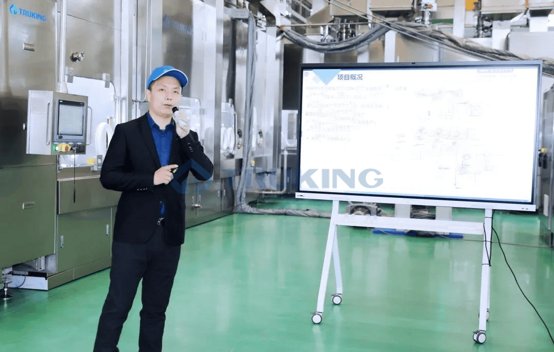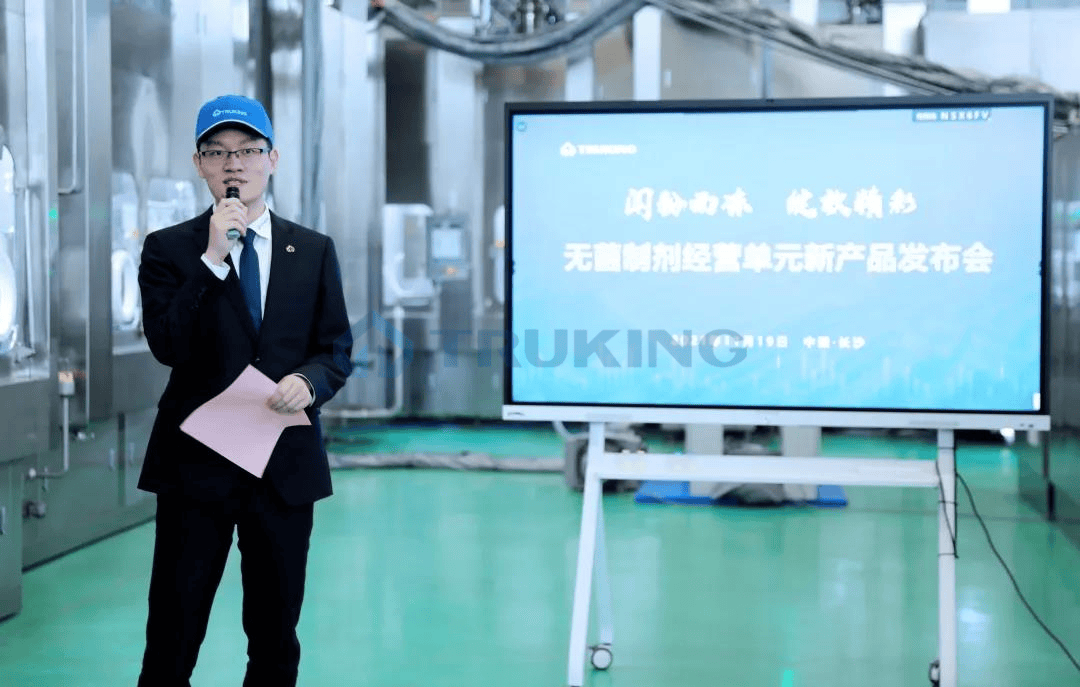 Ченг Пейци, директор подразделения асептической линейки оборудования Truking, проводит пресс-конференцию.